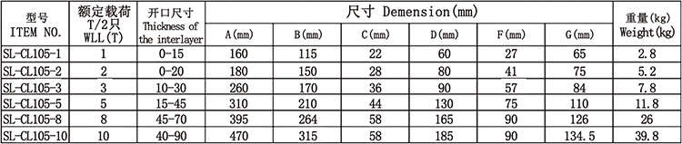 3、压角中纵线与压口底平面夹角随夹持物厚度的不同在30度到80度内变化,随吊重增加夹紧力也成比例增加。